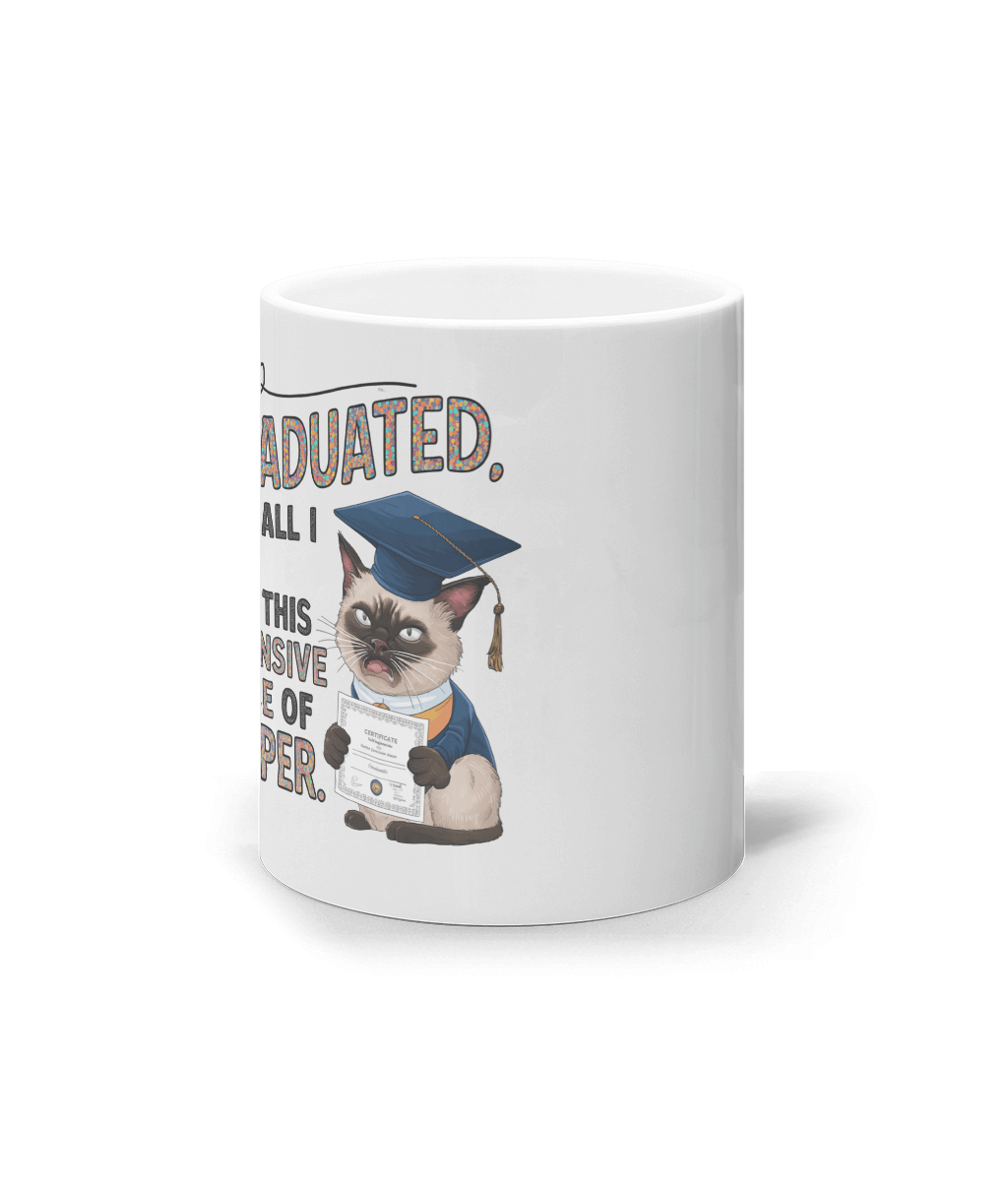 Există două tipuri de absolvenți: cei care fac poze cu diplomele și cei care râd de ele. Dacă ai în viața ta un absolvent cu simțul umorului bine dezvoltat, această cană e pentru el. Pisica morocănoasă, toca și diploma spun totul: „Am muncit, am terminat… și tot ce-am primit e o hârtie scumpă.” O replică savuroasă, numai bună de oferit cadou – la pachet cu cafea, ceai sau ciocolată caldă.