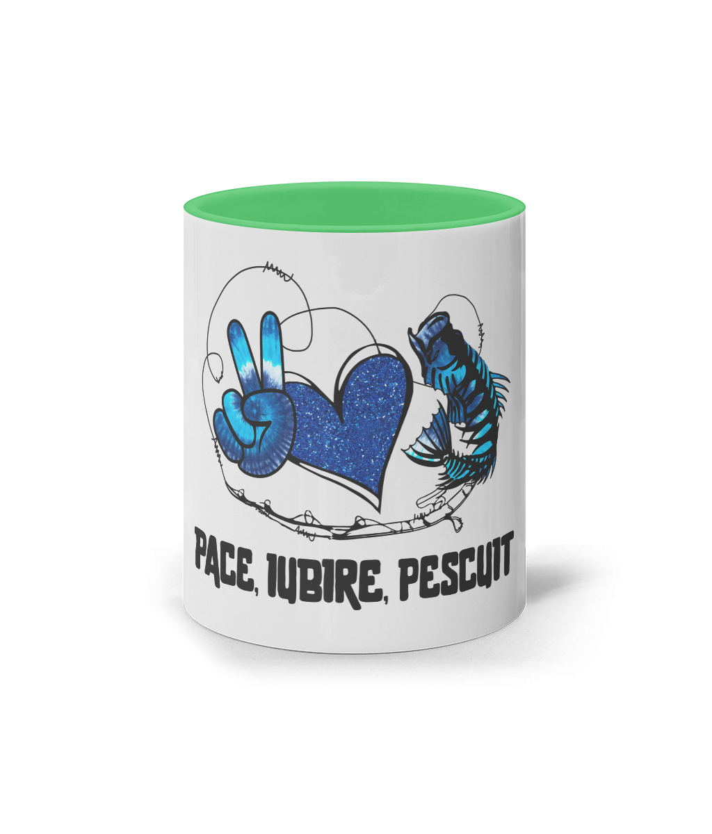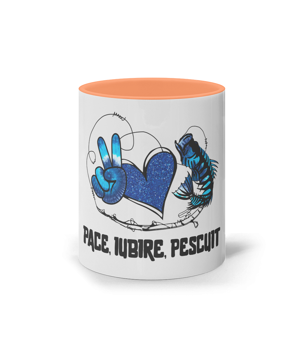 Cană ceramică colorată „Pace, iubire, pescuit”