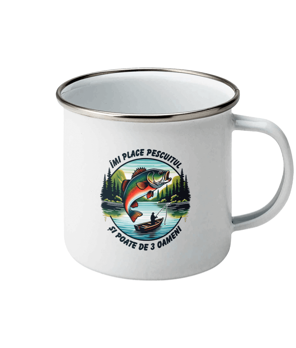 🪣 Cană emailată „Îmi place pescuitul și poate de 3 oameni” – Pentru campări în care râsul e prins la cârlig
