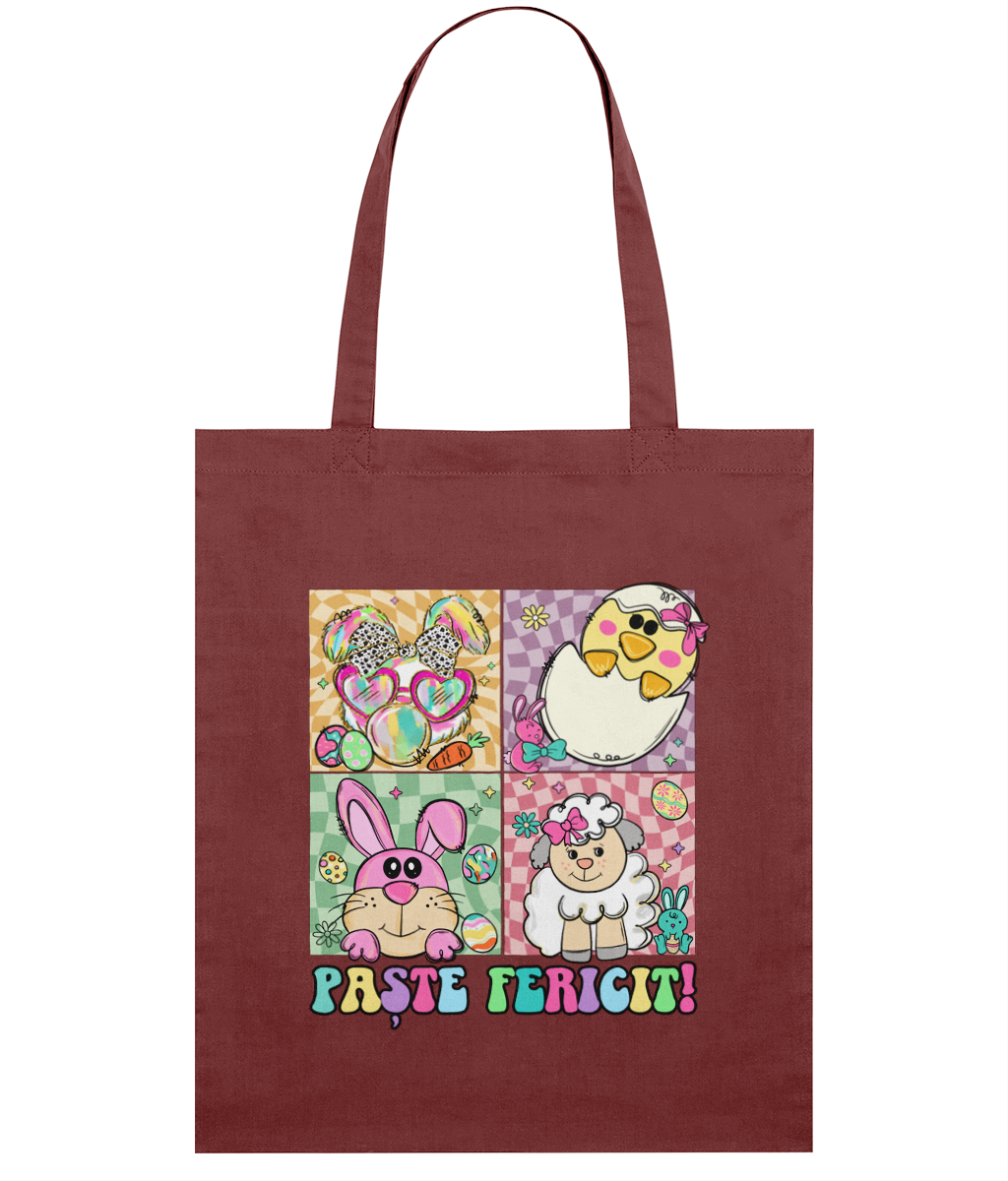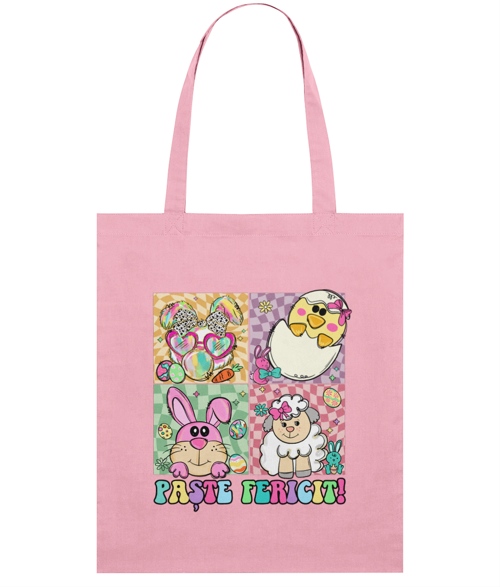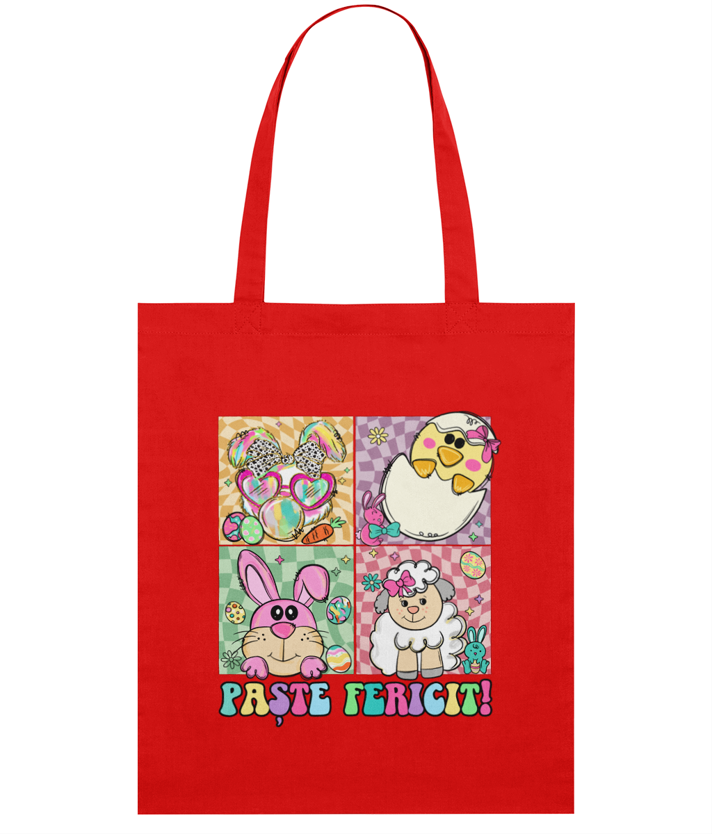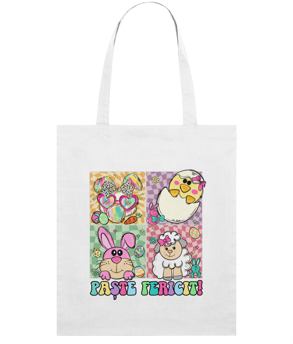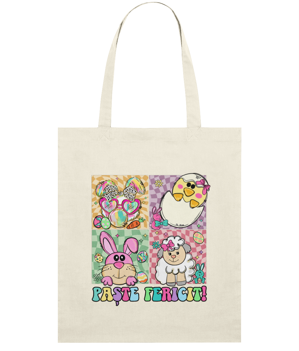 Adaugă un plus de culoare și bucurie cumpărăturilor sau plimbărilor tale cu această sacoșă ușoară din bumbac organic! Designul jucăuș cu textul „Paște Fericit” și ilustrații simpatice – un miel, doi iepurași haioși, un puișor ieșind din ou și ouă colorate – o transformă într-un accesoriu perfect pentru sărbători.