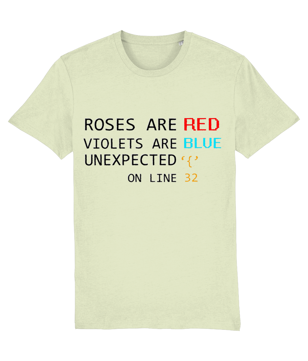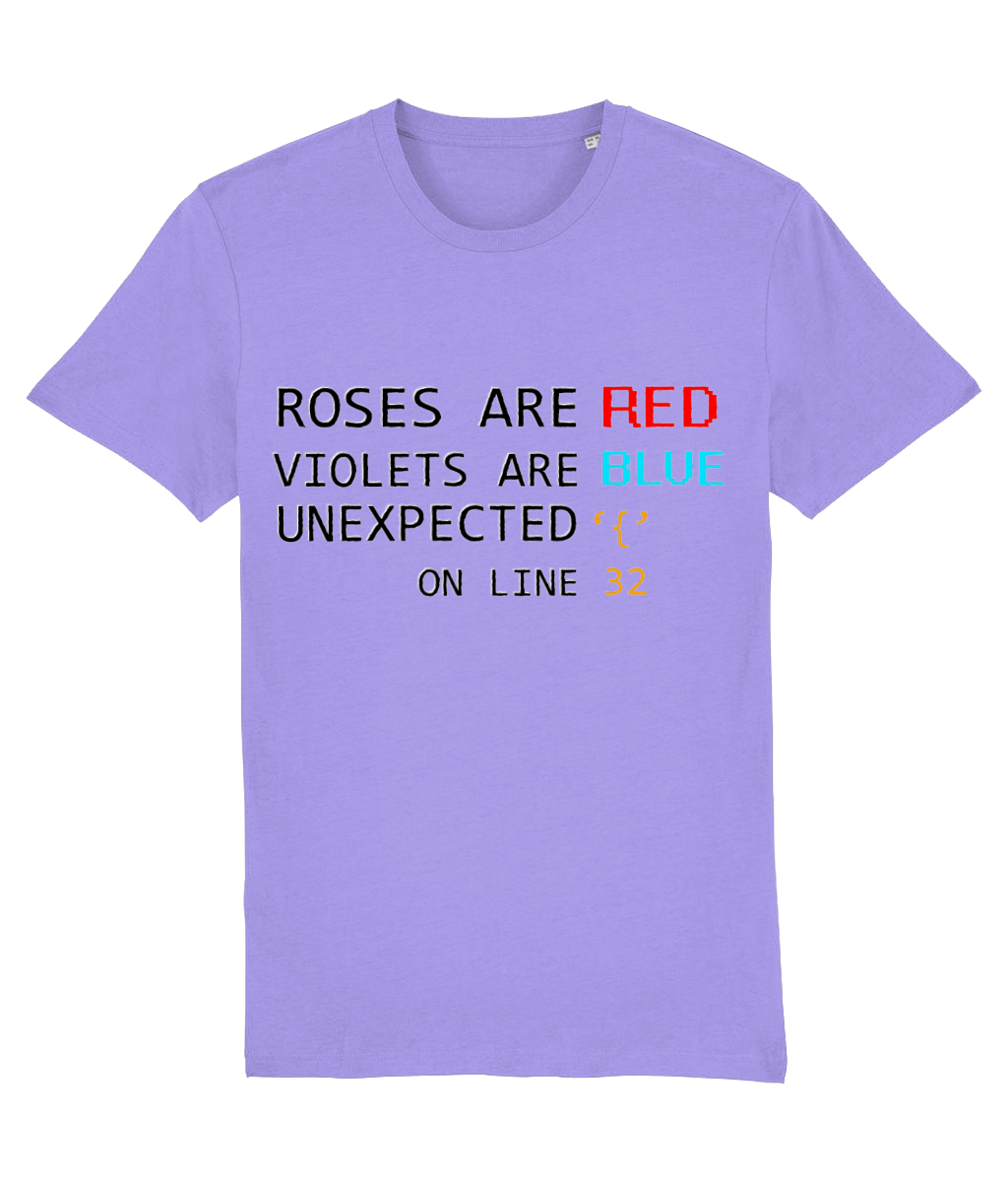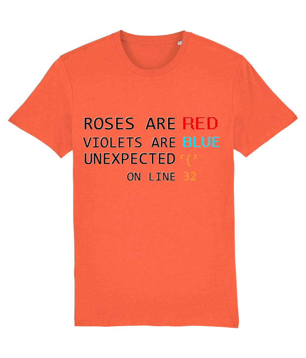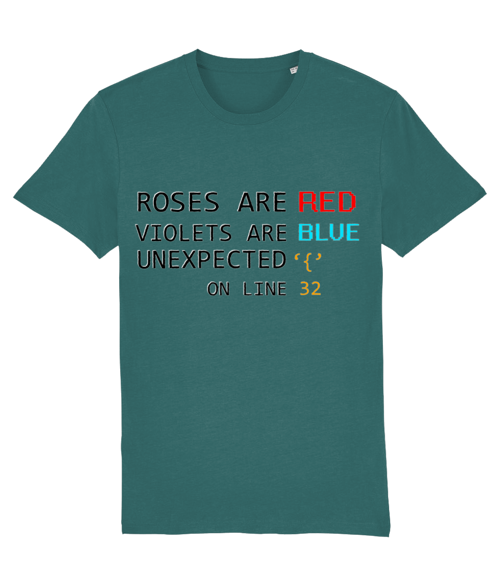 „Roses are red, Violets are blue, Unexpected { on line 32.” – un vers devenit legendă printre programatori. Acest tricou combină poezia clasică cu panica unui bug, în cel mai cool mod posibil. Accentele colorate din design adaugă un strop de personalitate, iar croiala unisex îl face potrivit pentru oricine iubește codul și glumele bune.