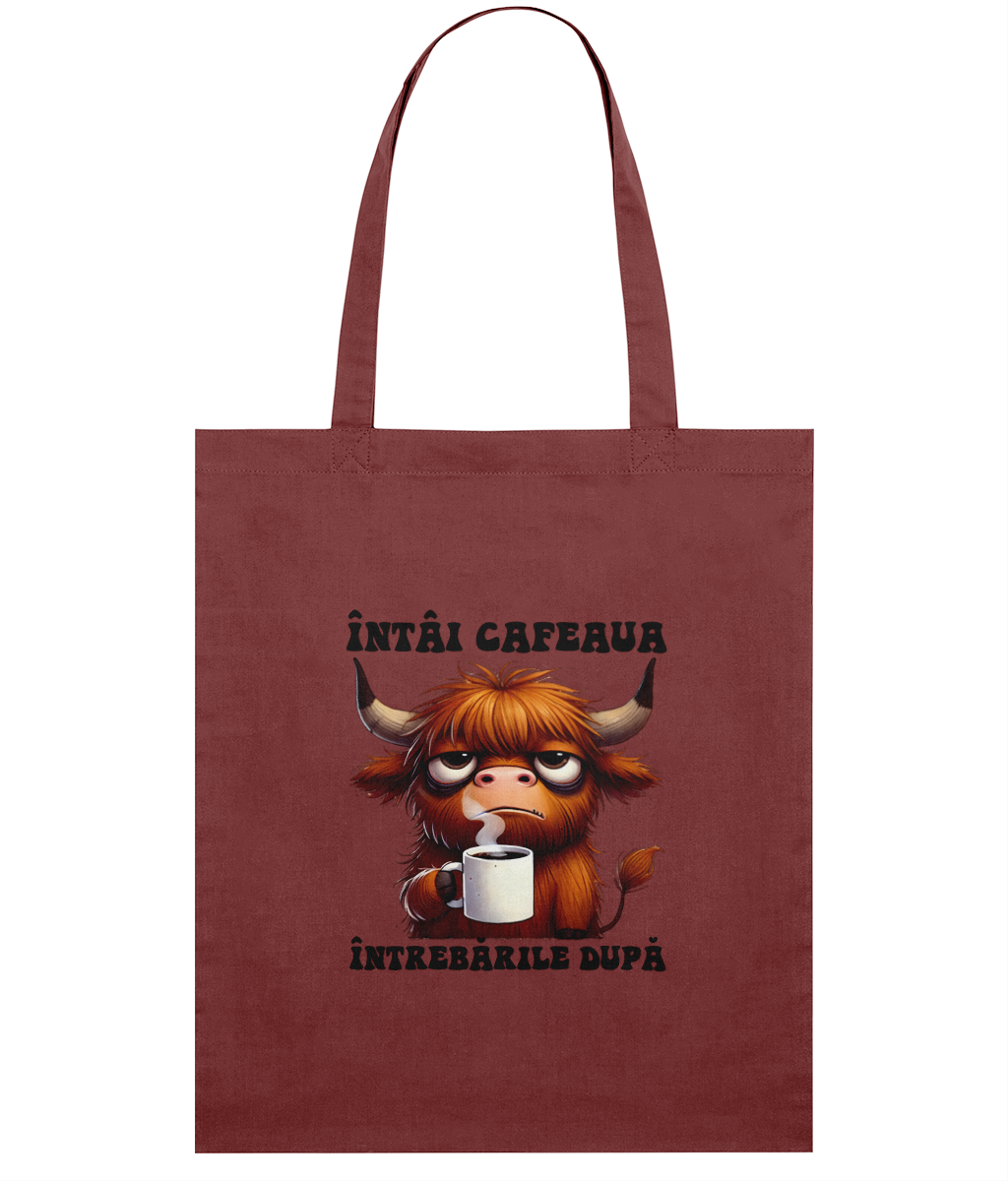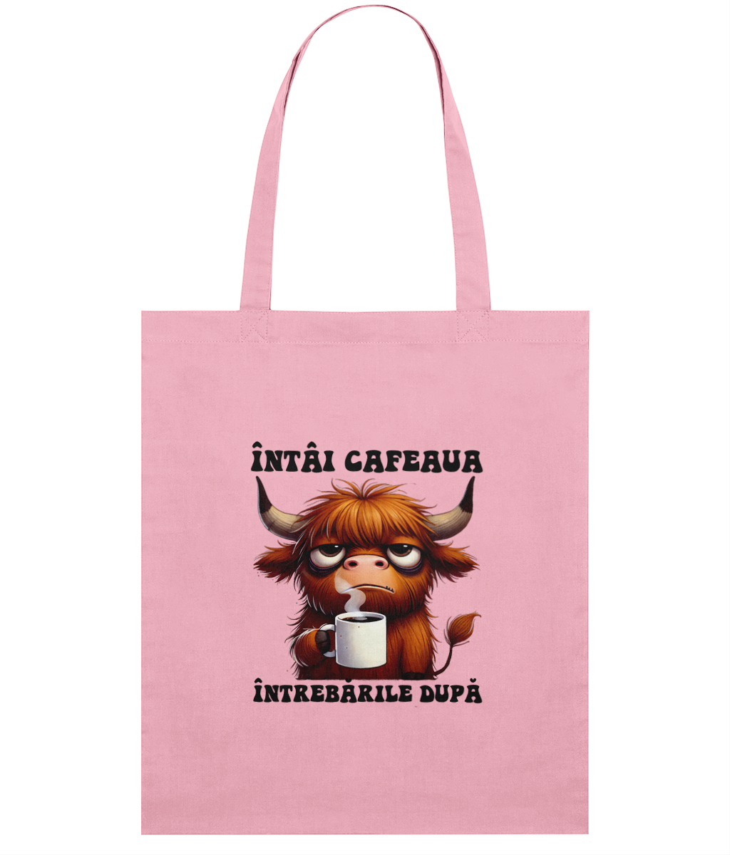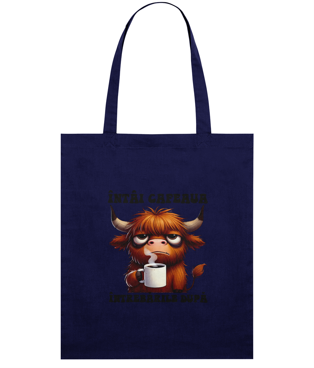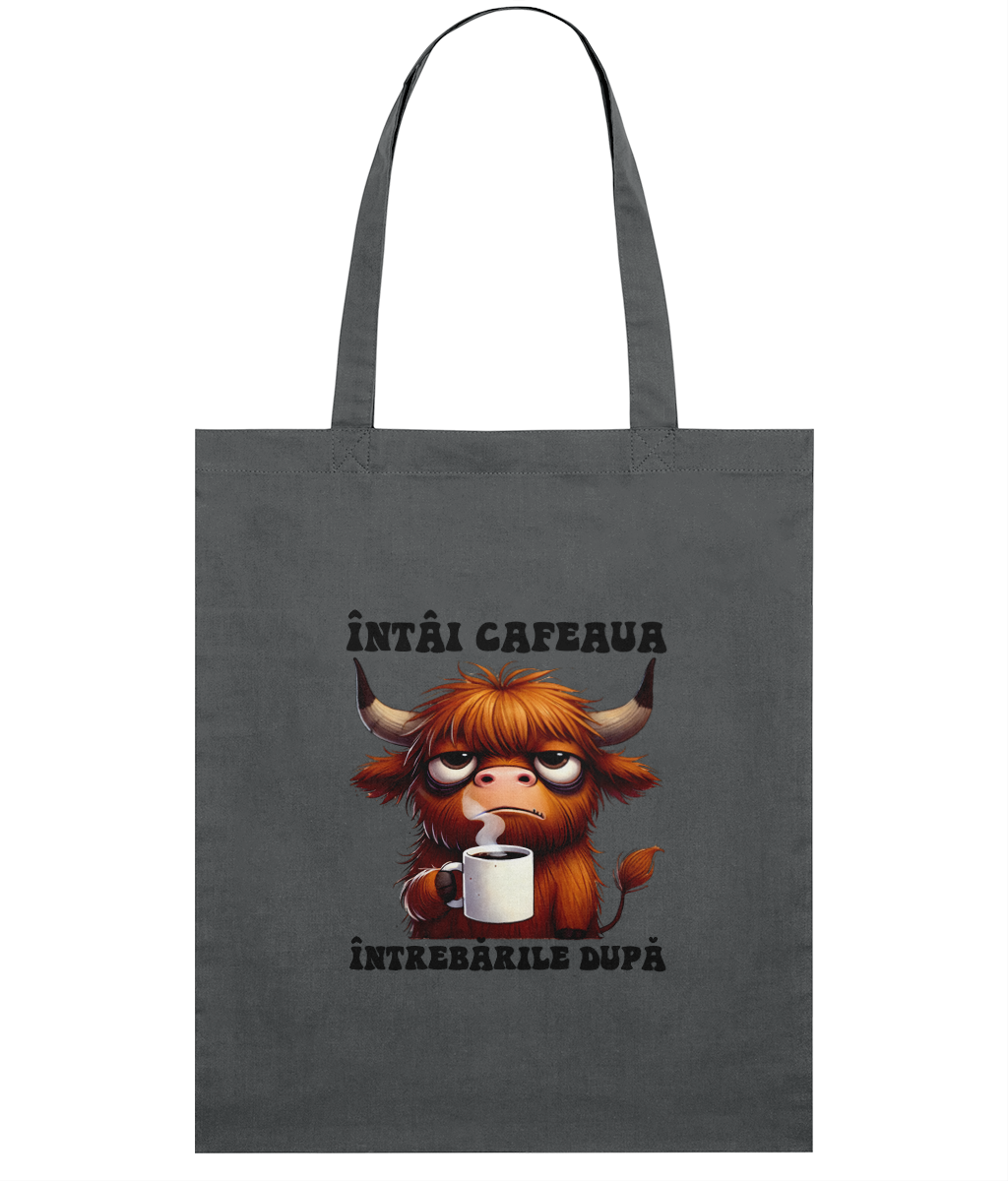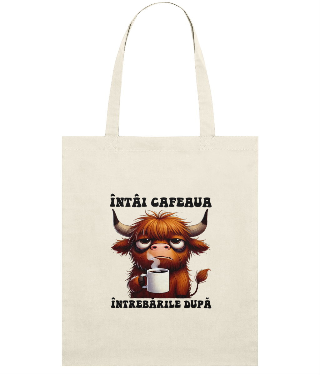 Sacoșă din bumbac „Întâi cafeaua, întrebările după” – cadoul perfect pentru prietenii cu priorități clare