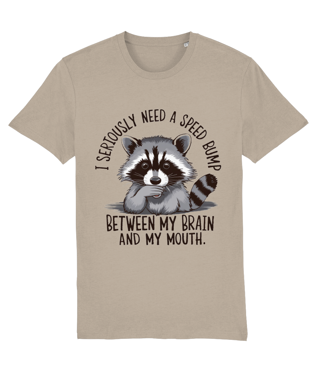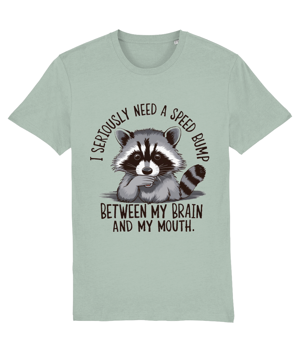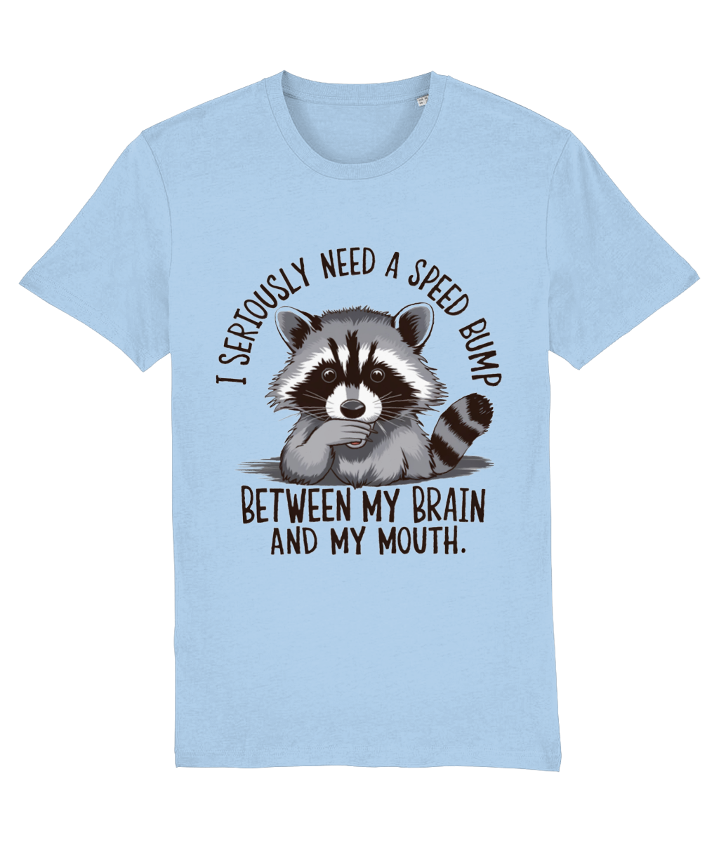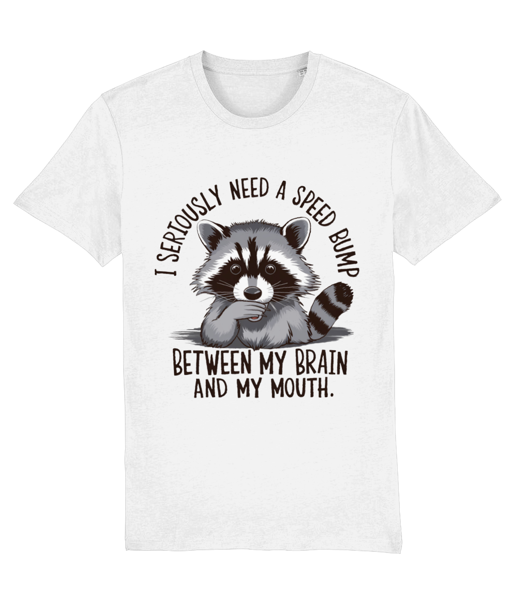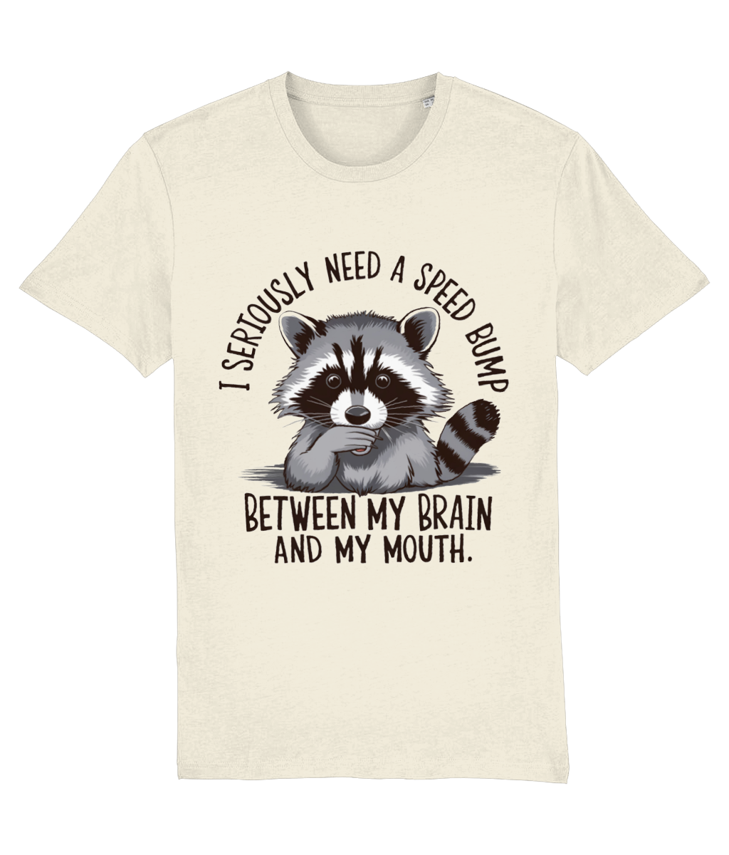 Ai tendința de a spune lucruri fără să le filtrezi? Sau cunoști pe cineva care face asta? Atunci acest tricou cu ratonul surprins și mesajul „I seriously need a speed bump between my brain and my mouth” este perfect!