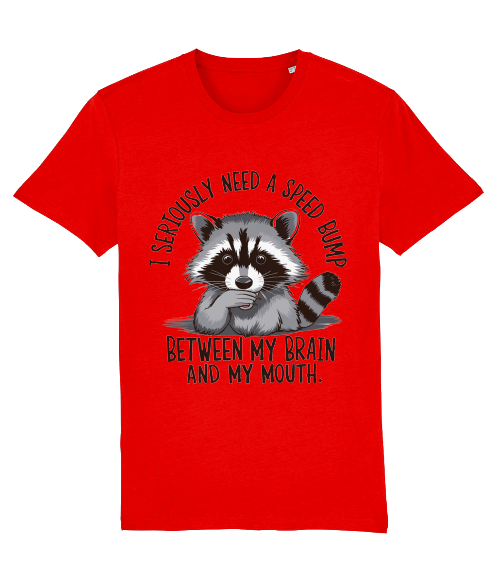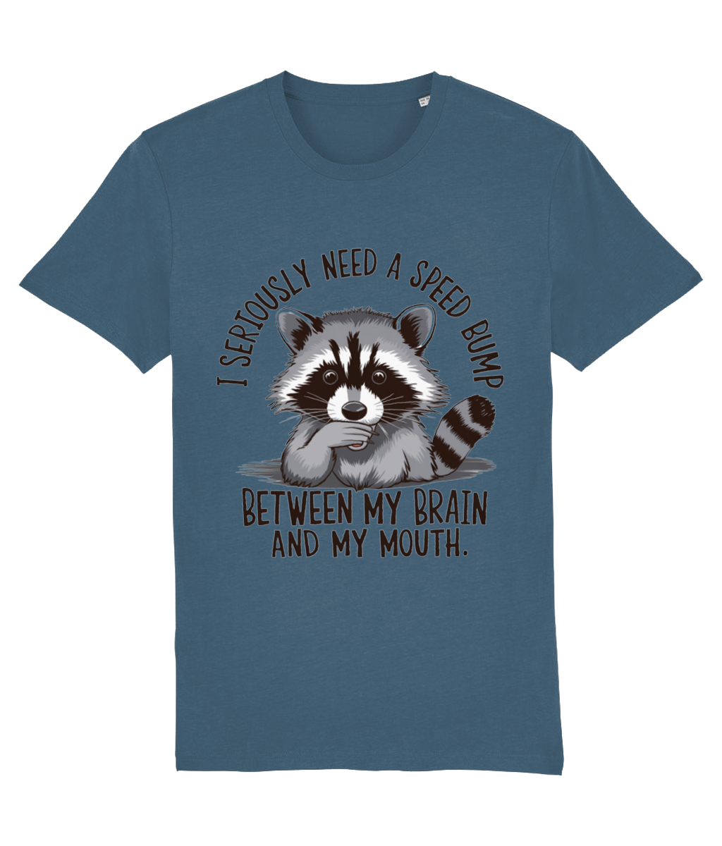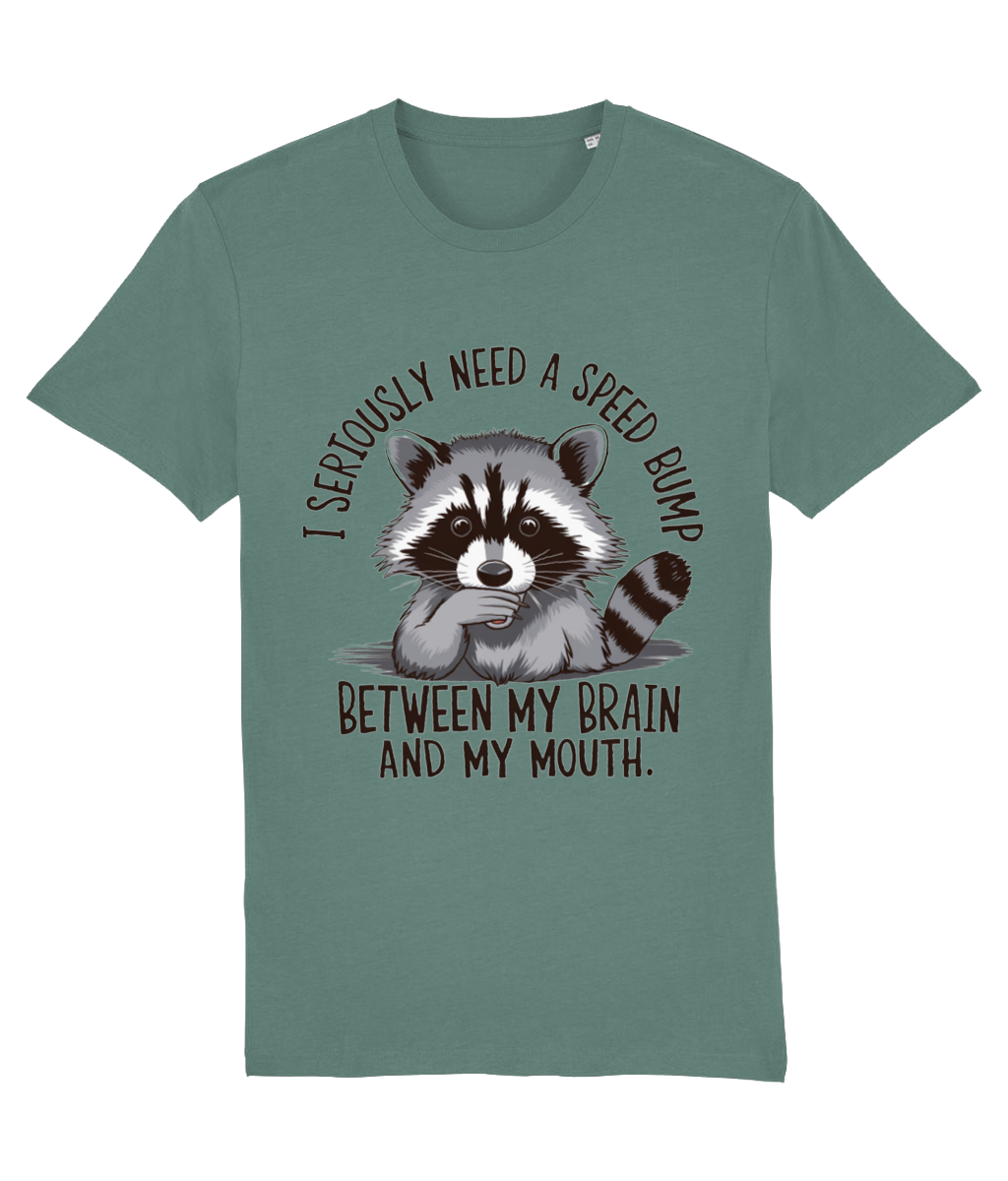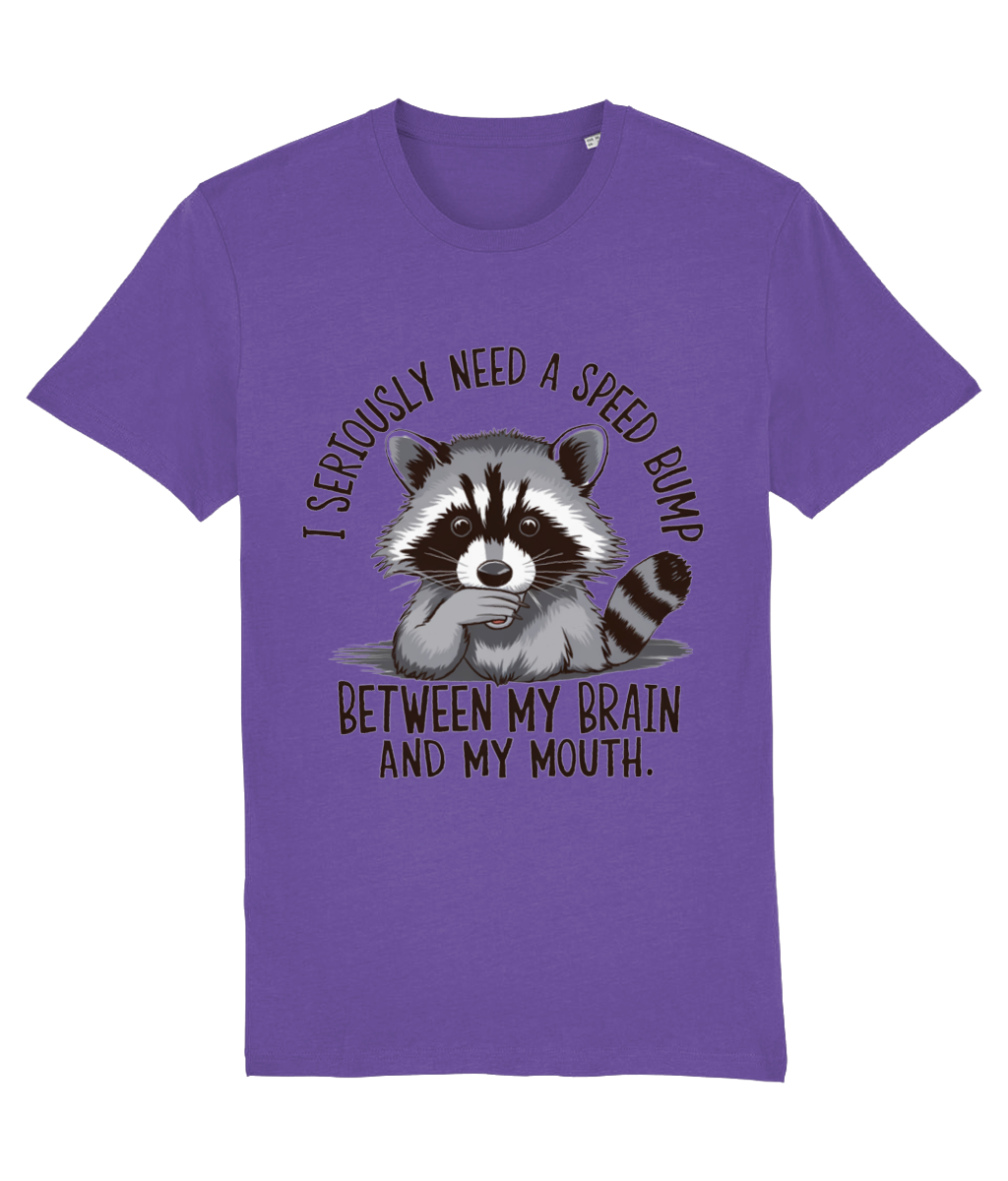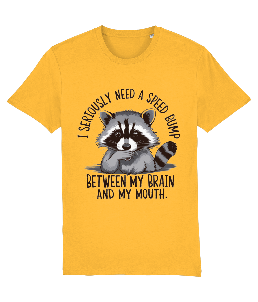 Ai tendința de a spune lucruri fără să le filtrezi? Sau cunoști pe cineva care face asta? Atunci acest tricou cu ratonul surprins și mesajul „I seriously need a speed bump between my brain and my mouth” este perfect!