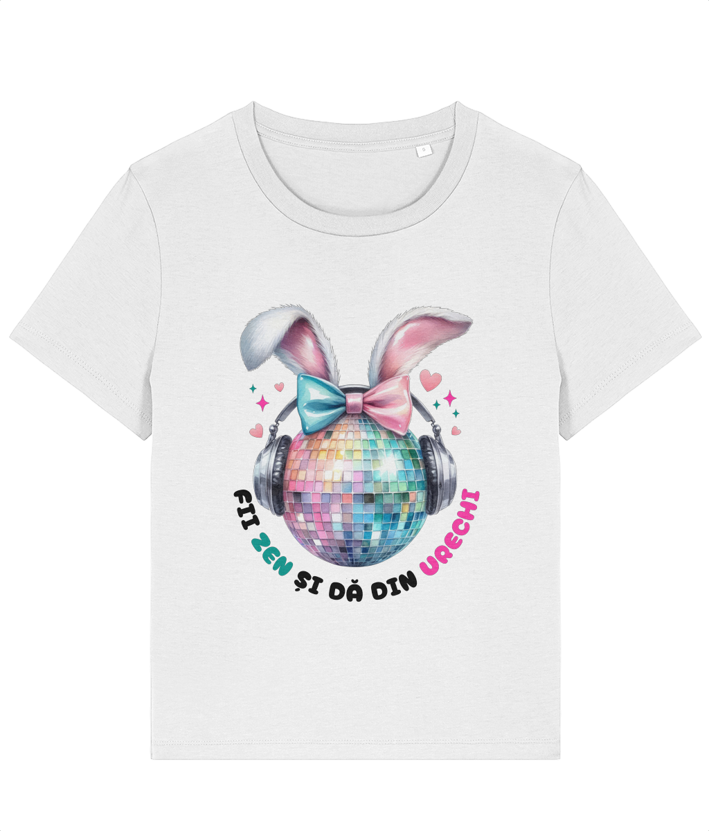 Acest tricou cu un glob disco pastelat purtând căști și urechi de iepure, alături de mesajul „Fii zen și dă din urechi”, este perfect pentru iubitoarele de muzică, dans și atmosferă festivă de Paște.