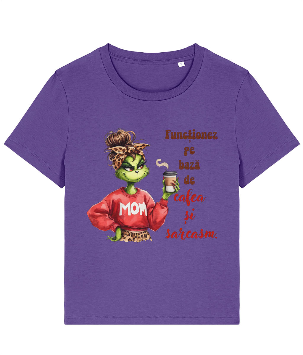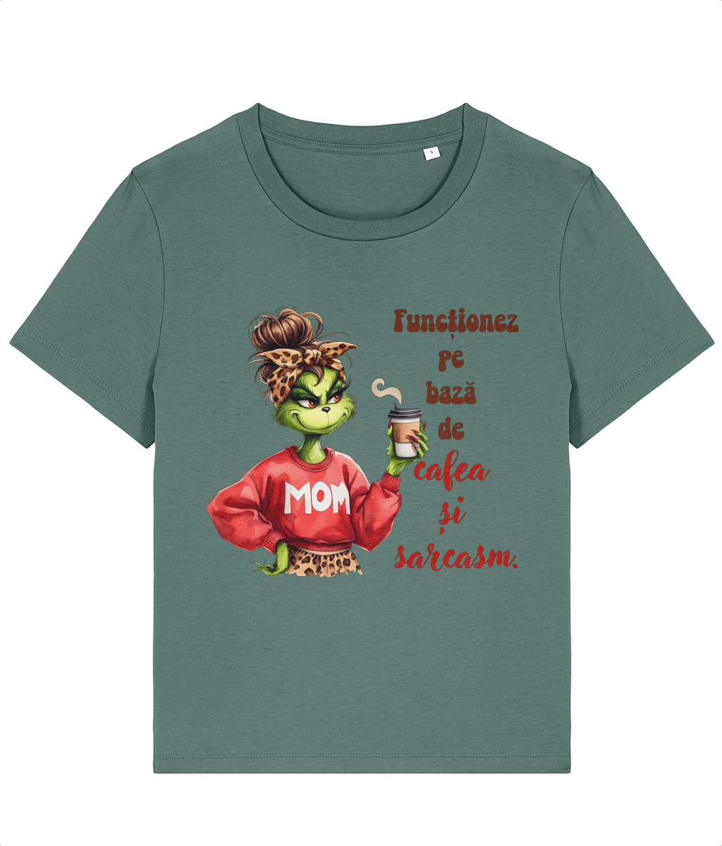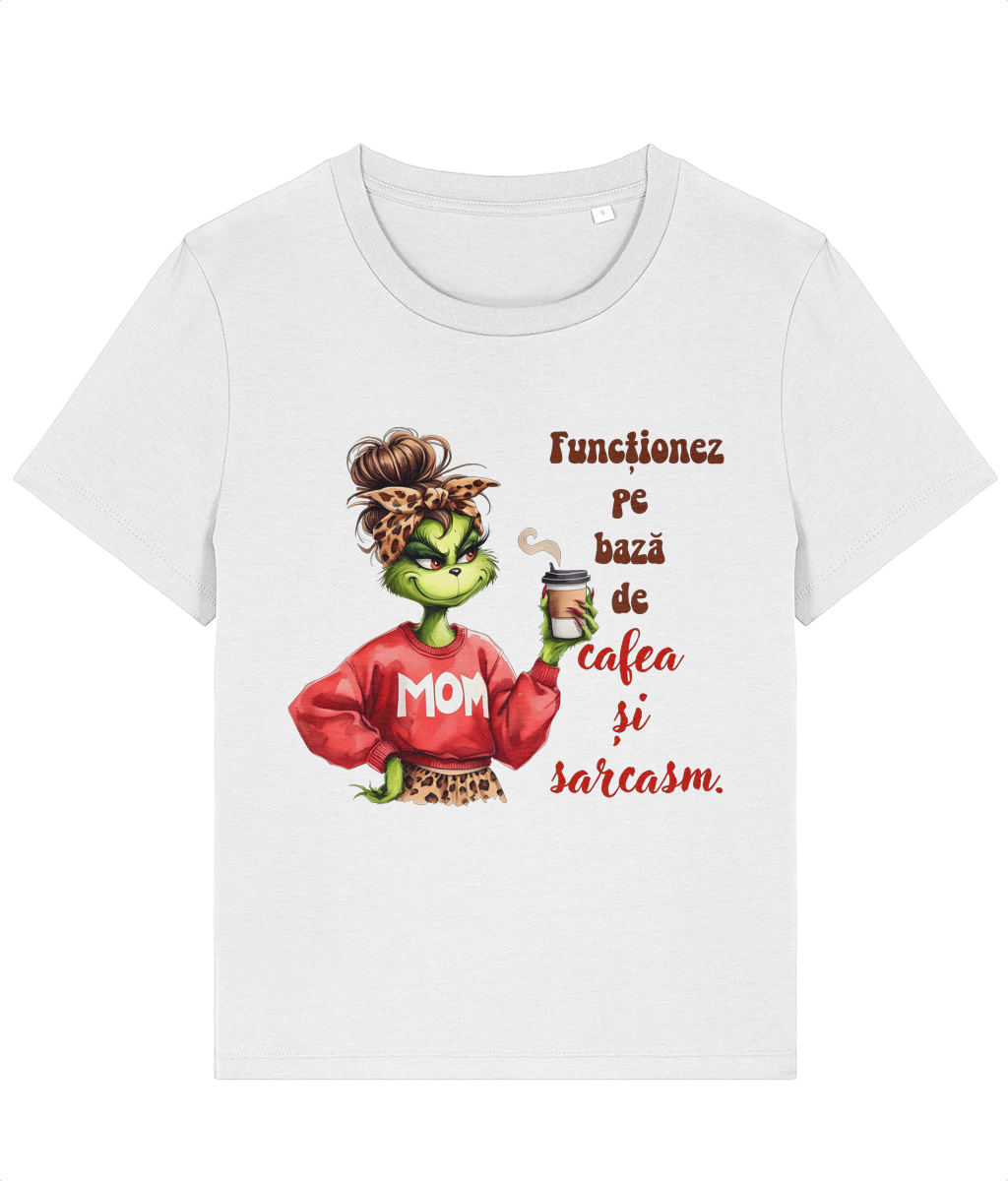 Tricou Damă „Funcționez pe bază de cafea și sarcasm” – Pentru femeile cu replici ascuțite! ☕💬