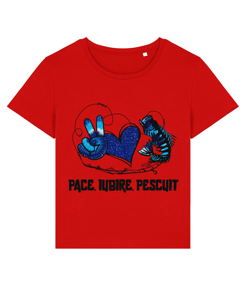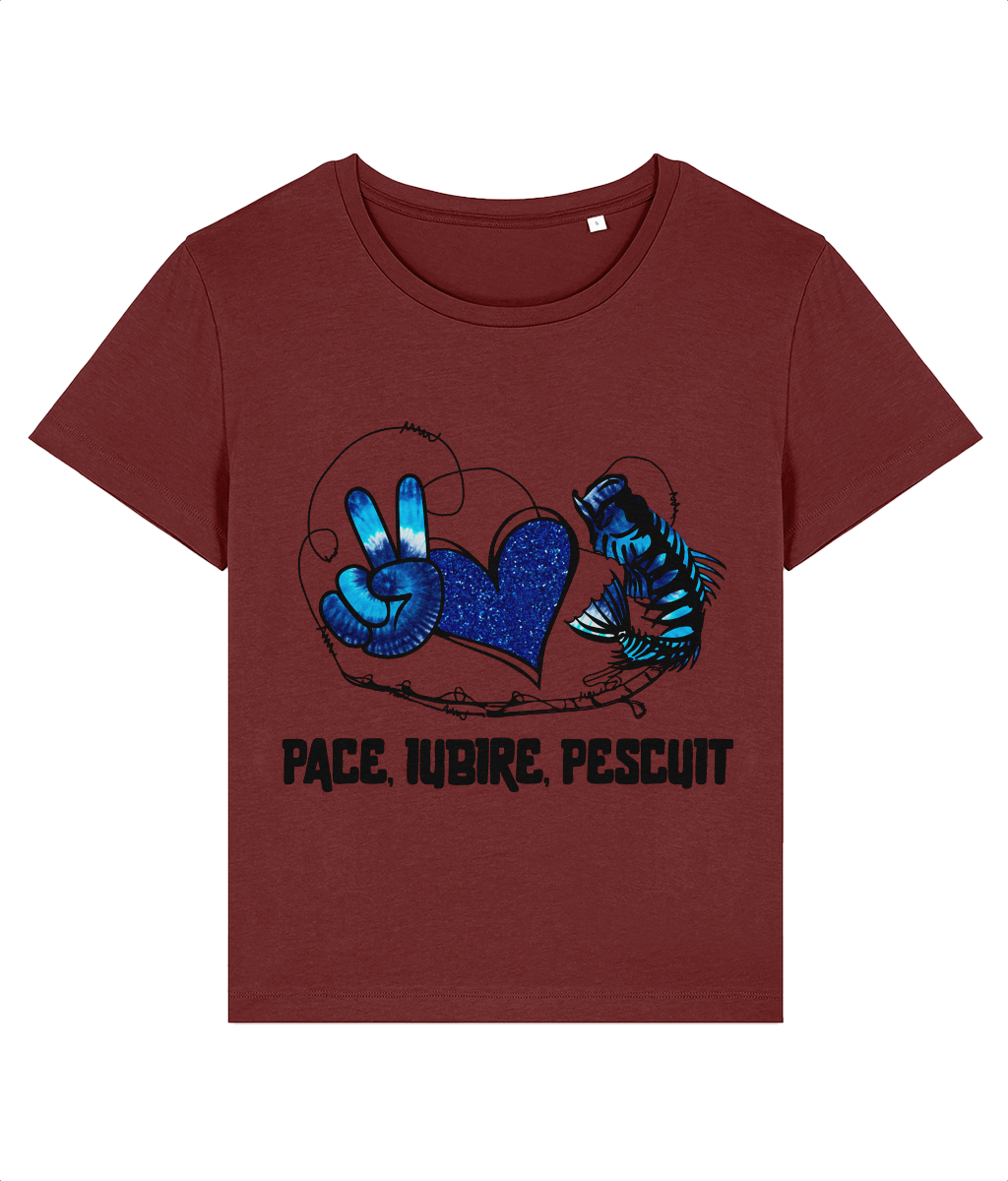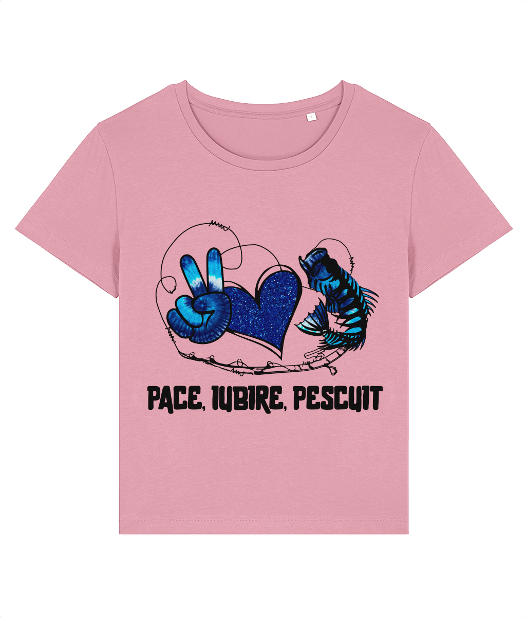 👚 Tricou damă „Pace, Iubire, Pescuit” – Pentru fete care știu că liniștea se găsește pe malul apei