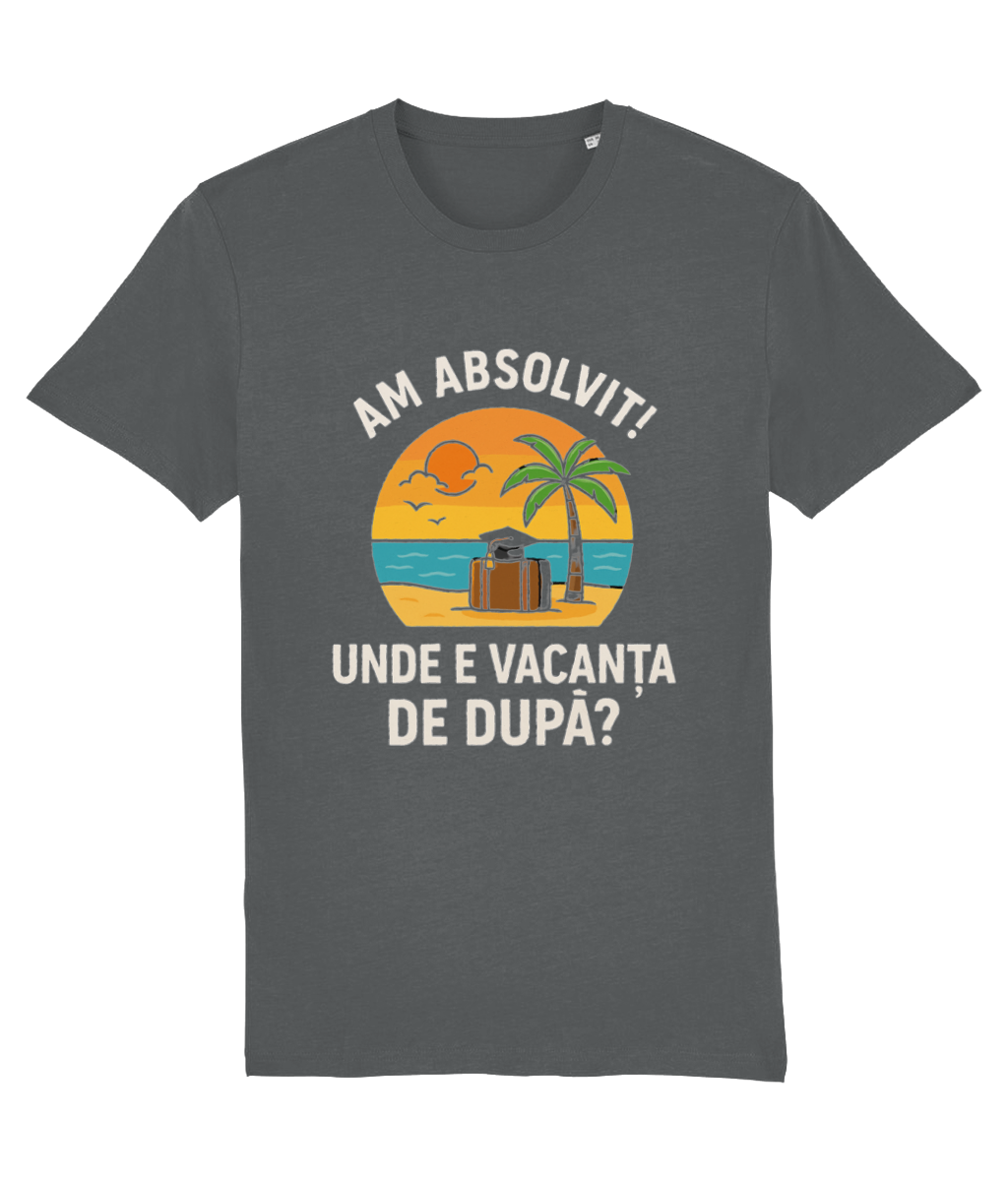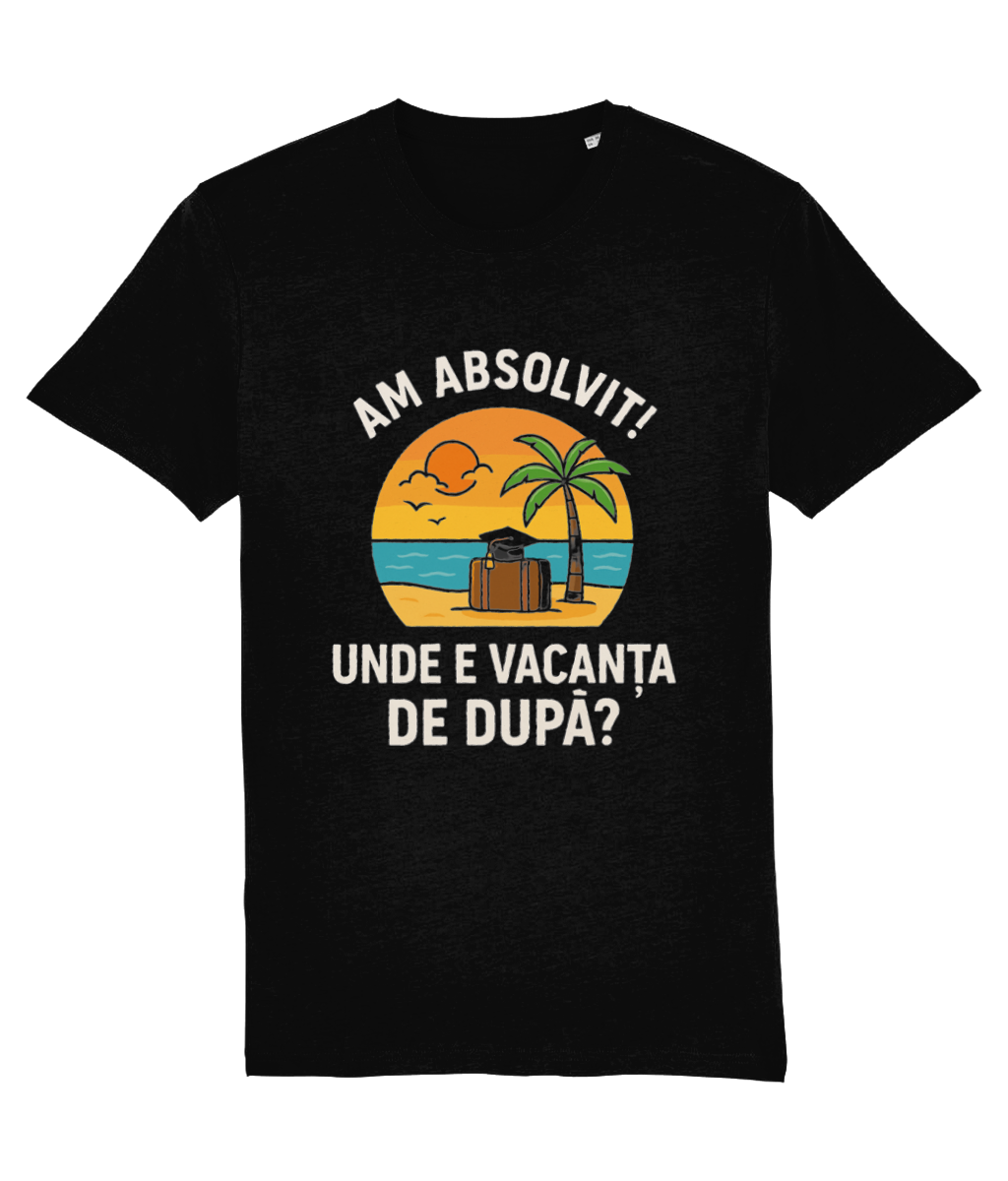 🌴 Tricou unisex „Am absolvit! Unde e vacanța de după?” – Pentru absolvenții cu dor de duuuuucă