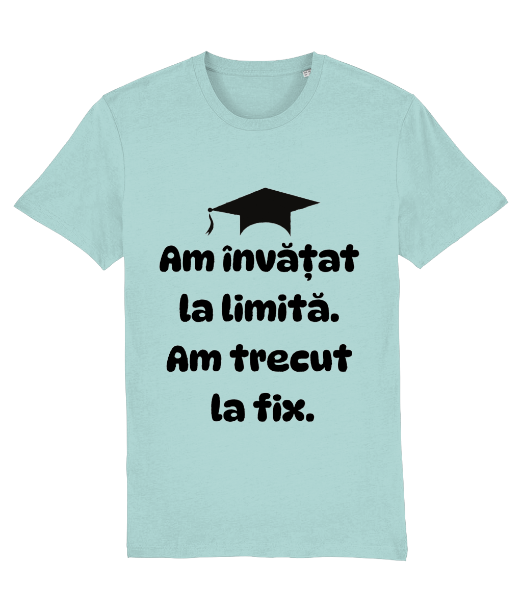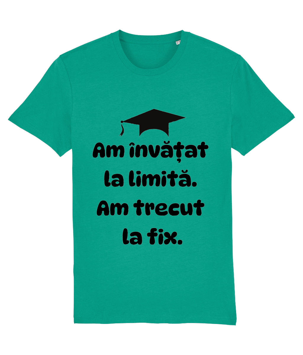 N-ai fost niciodată primul la predat proiectul, dar ai fost acolo. Nu te-ai trezit la toate cursurile, dar la examen ai venit. Cu două energizante, speranță și un pic de magie. Tricoul „Am învățat la limită. Am trecut la fix.” e declarația de independență a tuturor absolvenților care și-au croit drumul prin liceu sau facultate pe muchie de cuțit – dar au reușit!