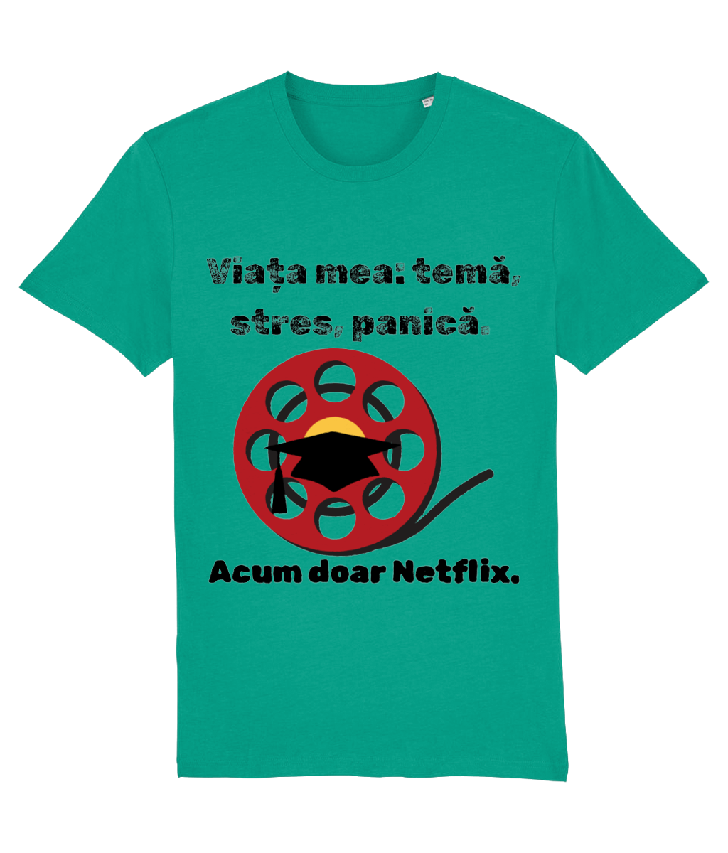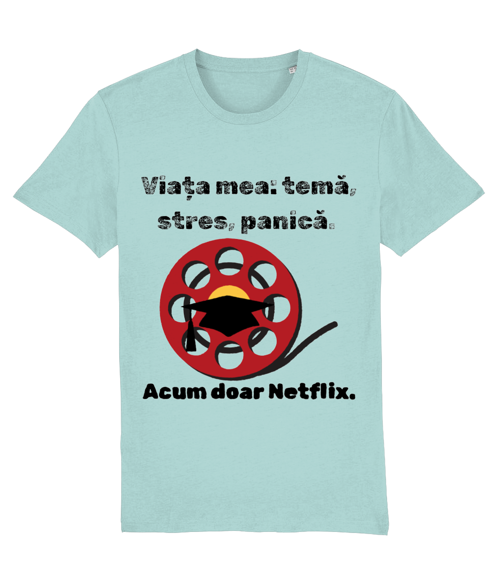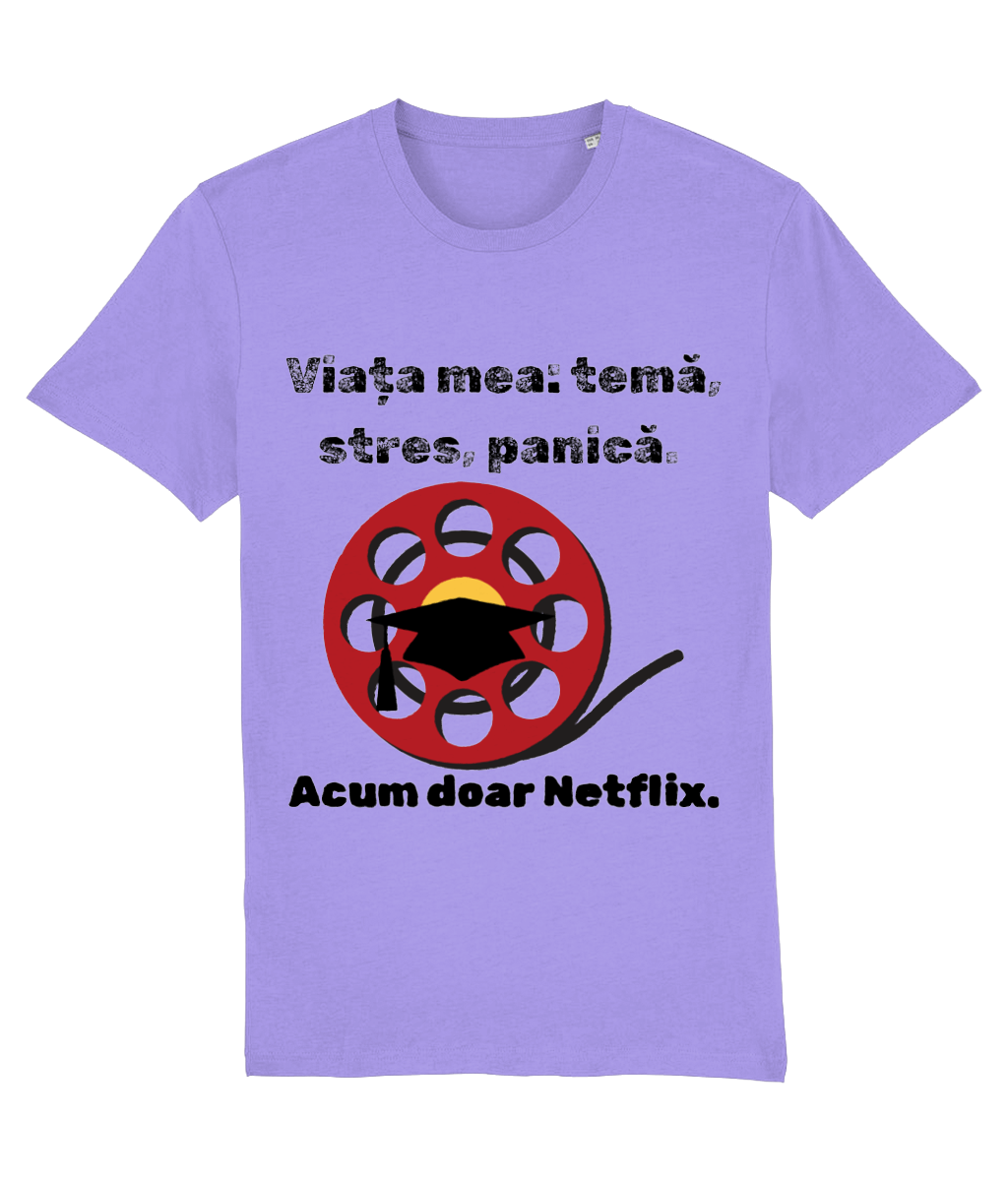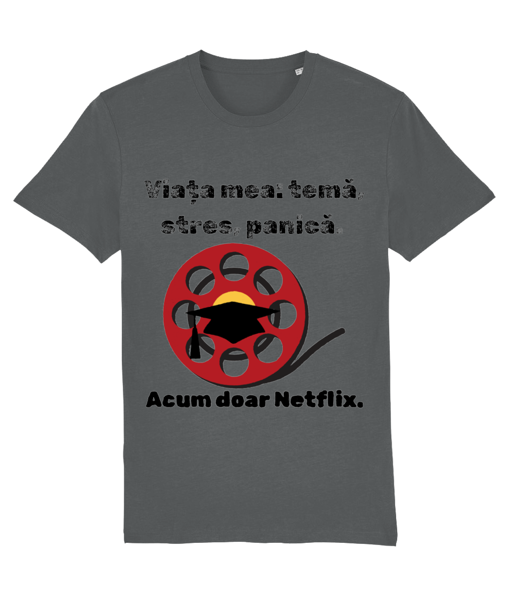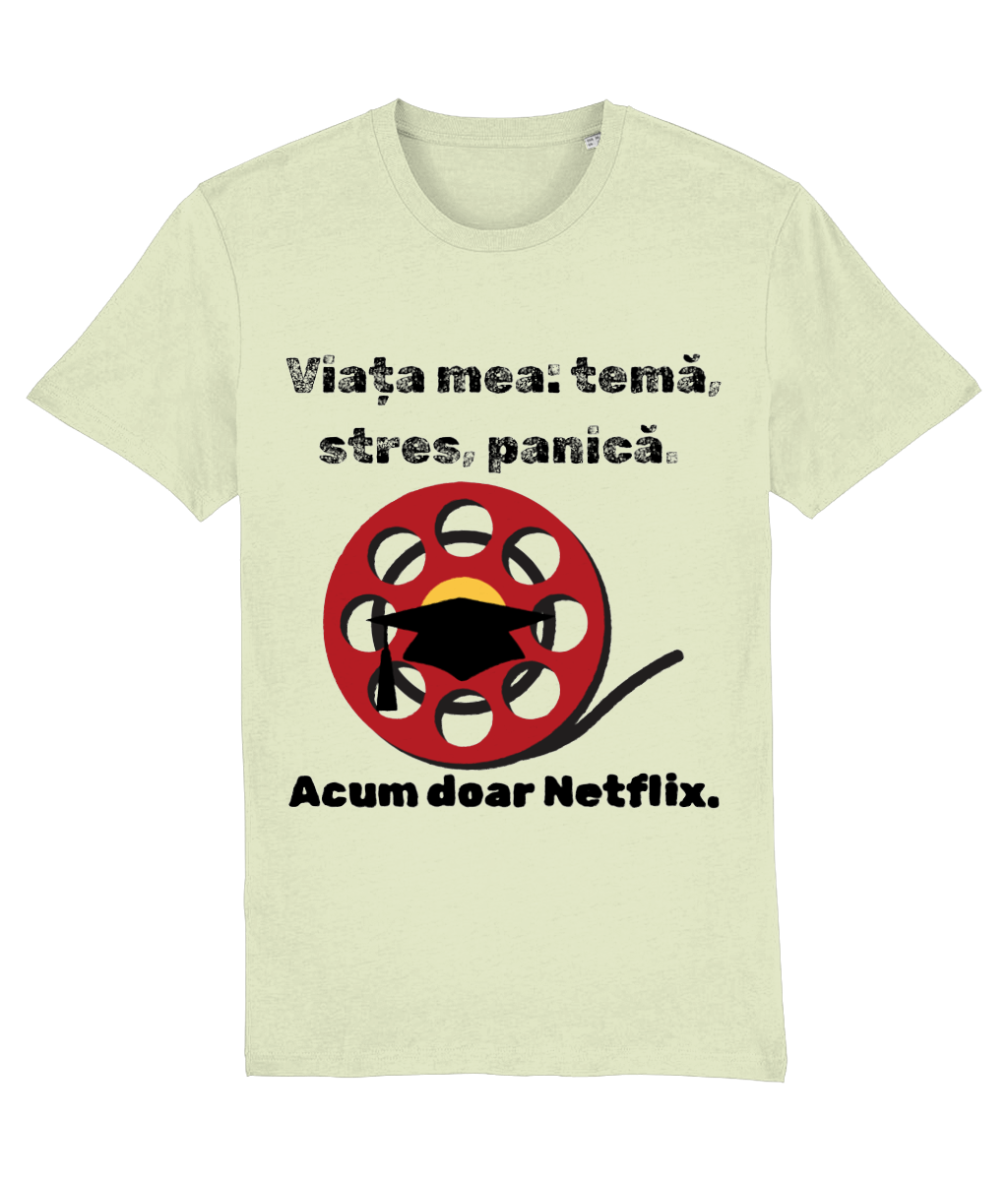 🎬 Tricou „Viața mea: temă, stres, panică. Acum doar Netflix” – Scenariul perfect după absolvire